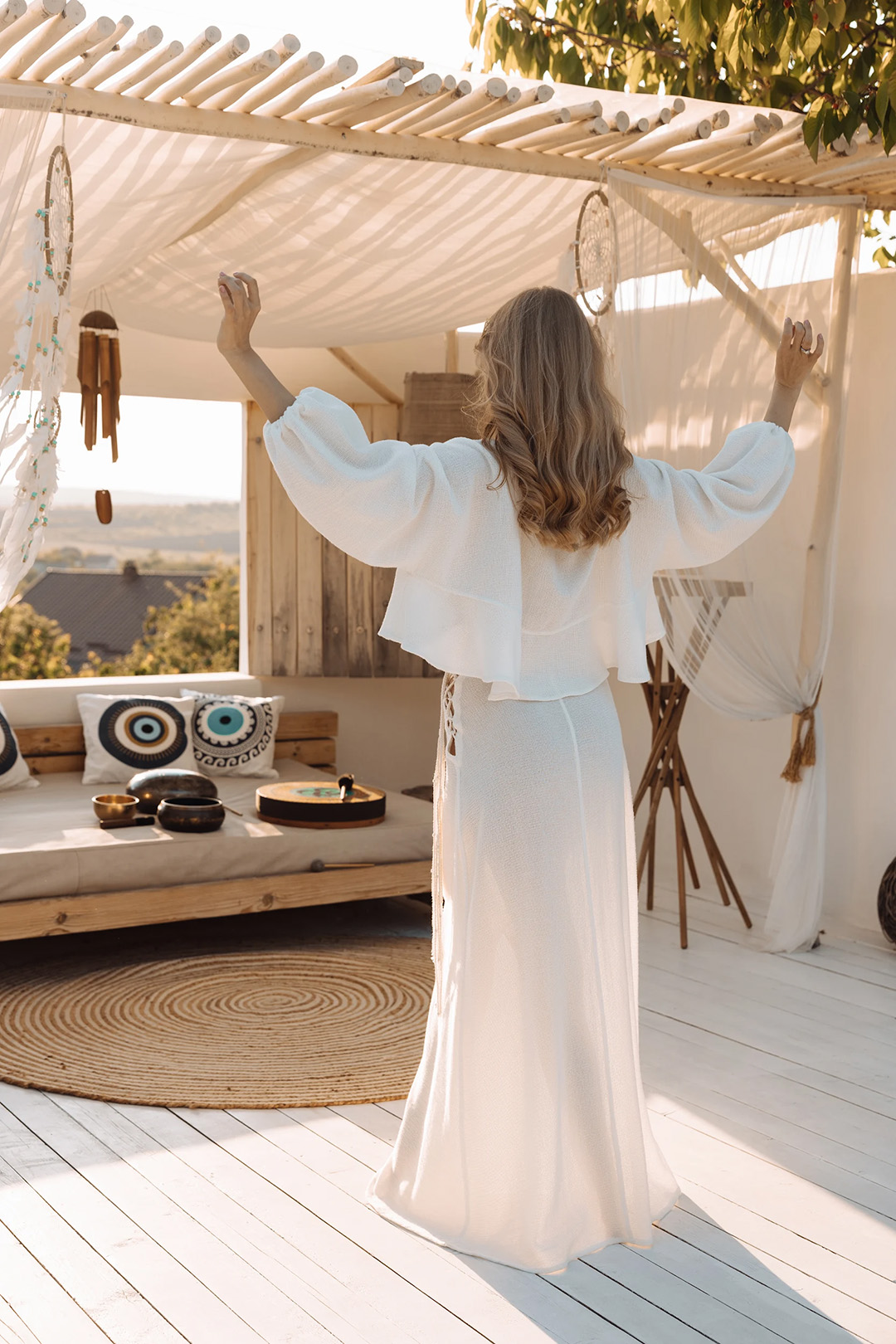 Experience the ultimate boho luxury with the „Bereginya” off-white two-piece set. Featuring a flowing cotton skirt and a stunning bamboo-macramé top, this handmade ensemble embodies grace, freedom, and the fire of creation.